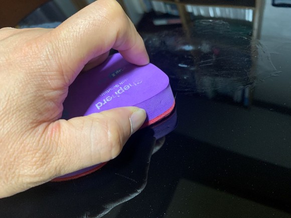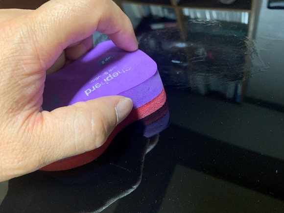 문지를 때에는 스펀지가 완전히 눌리도록 힘을 주어야 합니다. 그렇게 누르면 원래 두께의 1/3 수준이 됩니다. 큰 힘이 필요하진 않고 약간만 힘을 주어 지그시 누르면 그렇게 됩니다. 이렇게 누른 상태에서 문지르셔야 샌딩자국이 완전히 제거됩니다. 크림 바르듯 부드럽게만 문질러서는 샌딩자국이 완전히 제거되지 않습니다. 조금 힘이 들더라도 최소 초반 1분 정도는 힘을 주어 샌딩한 부위를 문질러야만 합니다.