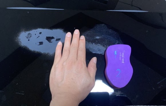 빨간색 스펀지 부분이 저렇게 눌림 없이 문질러서는 효과가 많이 부족합니다. 2분 가량 문질렀는데도 컴파운드가 줄어들지 않고 도장면에 계속 남아있죠? 컴파운드 양이 많을 때에도 그렇지만 충분한 압력이 가해지지 않는 경우에도 저렇게 됩니다.