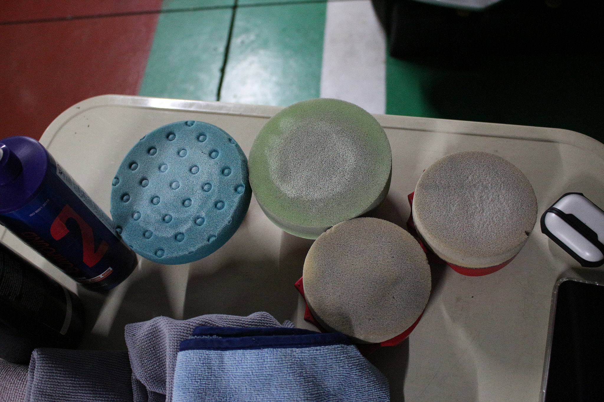 ☞ 도장의 묵은 때와 얕은 스월들을 제거해가며 작업했습니다. 아래 작은 패드 2개는 중간에 한 번 세척을 하였으니 모닝을 폴리싱하는데 총 6개(5인치 패드 2개, 4인치 패드 4개)의 패드를 사용한 셈입니다.