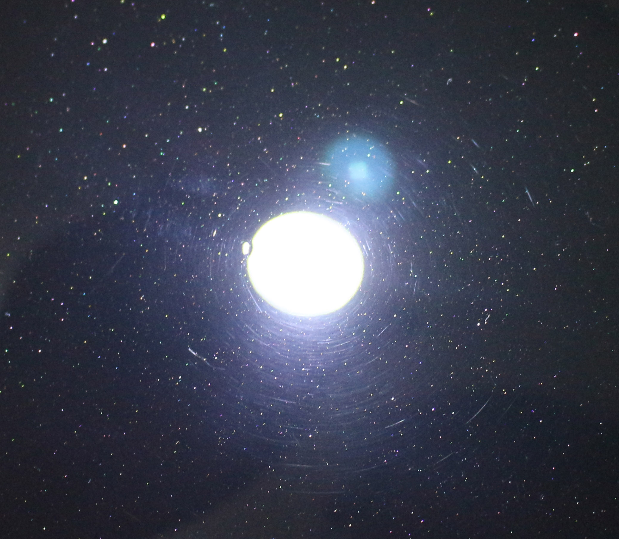 심한 스월은 줄어들고 대신 컴파운딩 마크가 남았습니다. 컴파운딩 마크가 광원 주위로 십자가 형태로 나타나는 것으로 보아 위아래 직선방향, 좌우 직선방향 모두 작업한 것으로 보이며 세로 방향이 조금 더 선명하게 나타나는 것으로 보아 좌우 직선 방향으로 더 많이 문지른 게 아닌가 싶습니다. 원형 방향으로 문지를 경우 컴파운딩 마크는 아래와 같이 광원 주변으로 동그랗게 보입니다.
