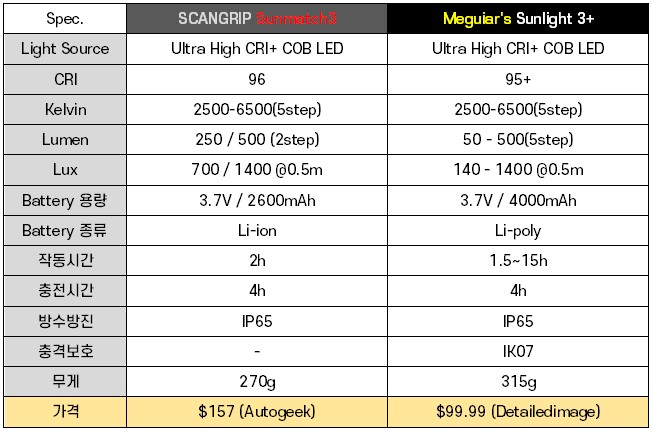 「Scangrip Sunmatch 3 vs. Meguiar's Sunlight 3+ 스펙 비교」