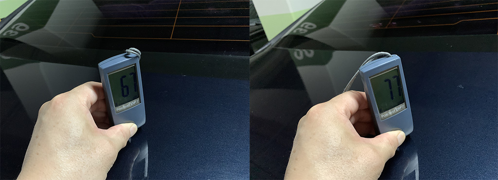 많게는 80미크론까지 찍히는 부위도 있었으나 70미크론이 채 안 되는 부위가 곳곳에서 발견되었습니다. 흠집이 얕은 편이 아닌데 도장 두께는 얇다는 것이 문제였습니다. 1차 컴파운딩 후에 남아 있는 스크래치는 도장두께를 측정하여 두께에 여유가 있는 곳은 부분적으로 파워 컴파운딩을 했고, 여유가 없는 곳은 추가 컴파운딩 없이 마무리 폴리싱을 했습니다.