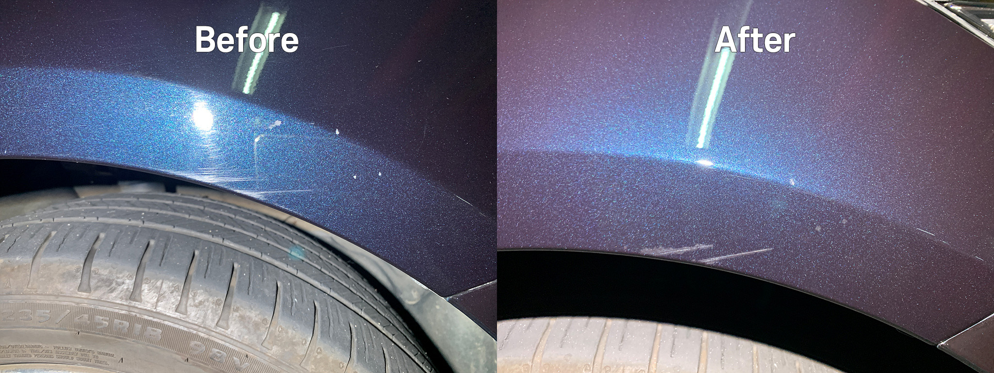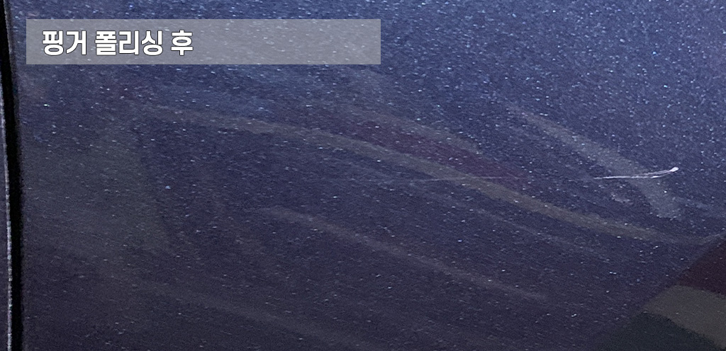 이번 작업에서는 깊은 스크래치에 대해서 핑거 폴리싱을 먼저 적용한 후 컴파운딩, 마무리 폴리싱 순으로 작업하였습니다. 도장이 파이거나 도장이 너무 얇아 더 이상 연마하기 곤란한 스크래치에 대해서는 가볍게 터치업하는 것으로 마무리지었습니다.