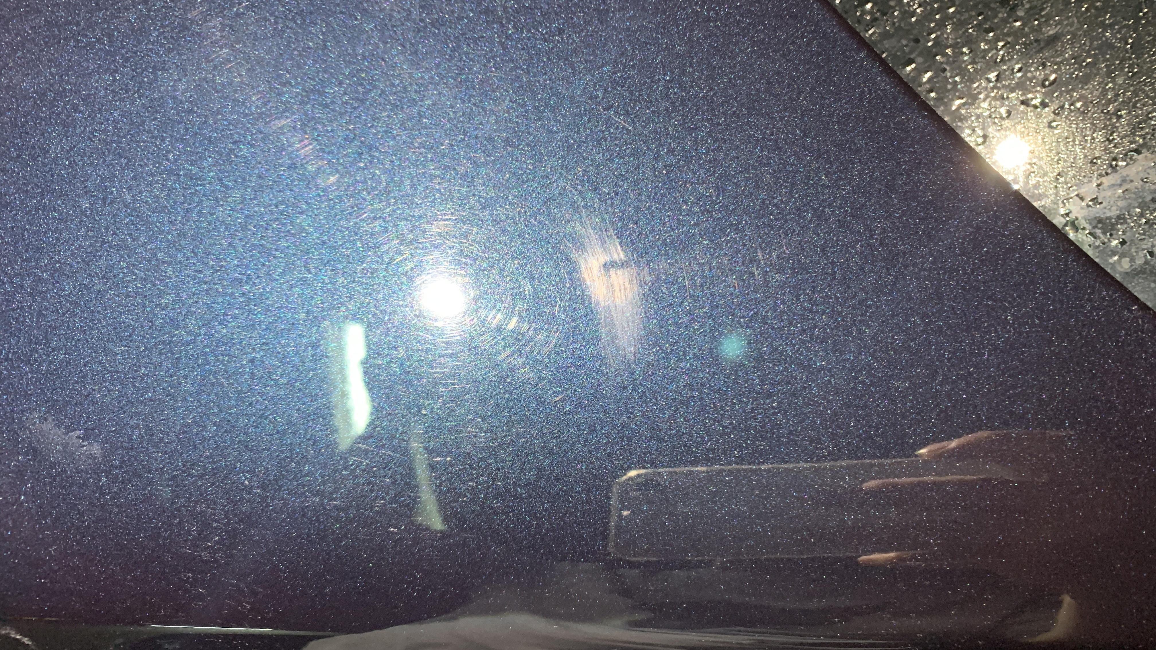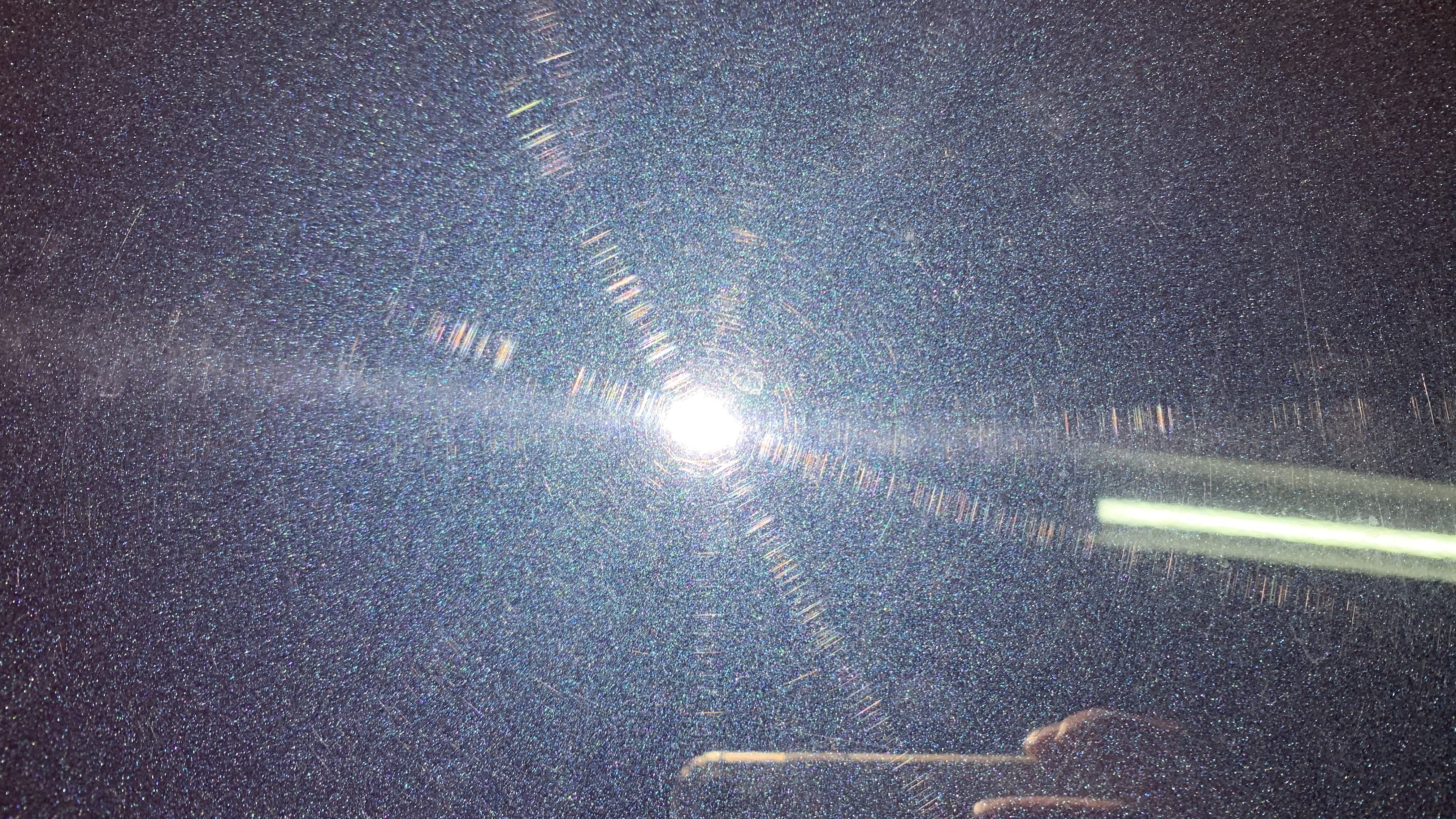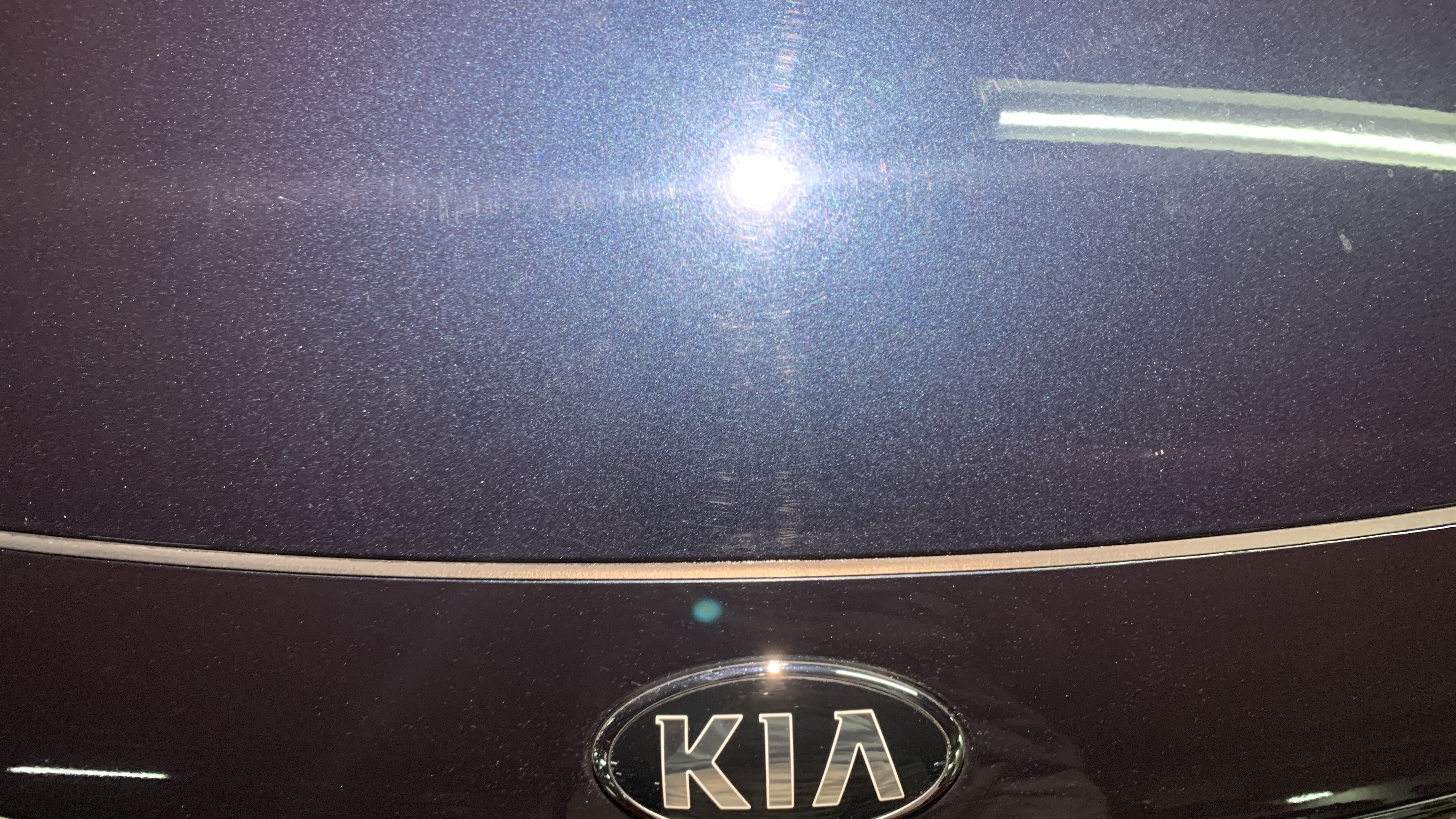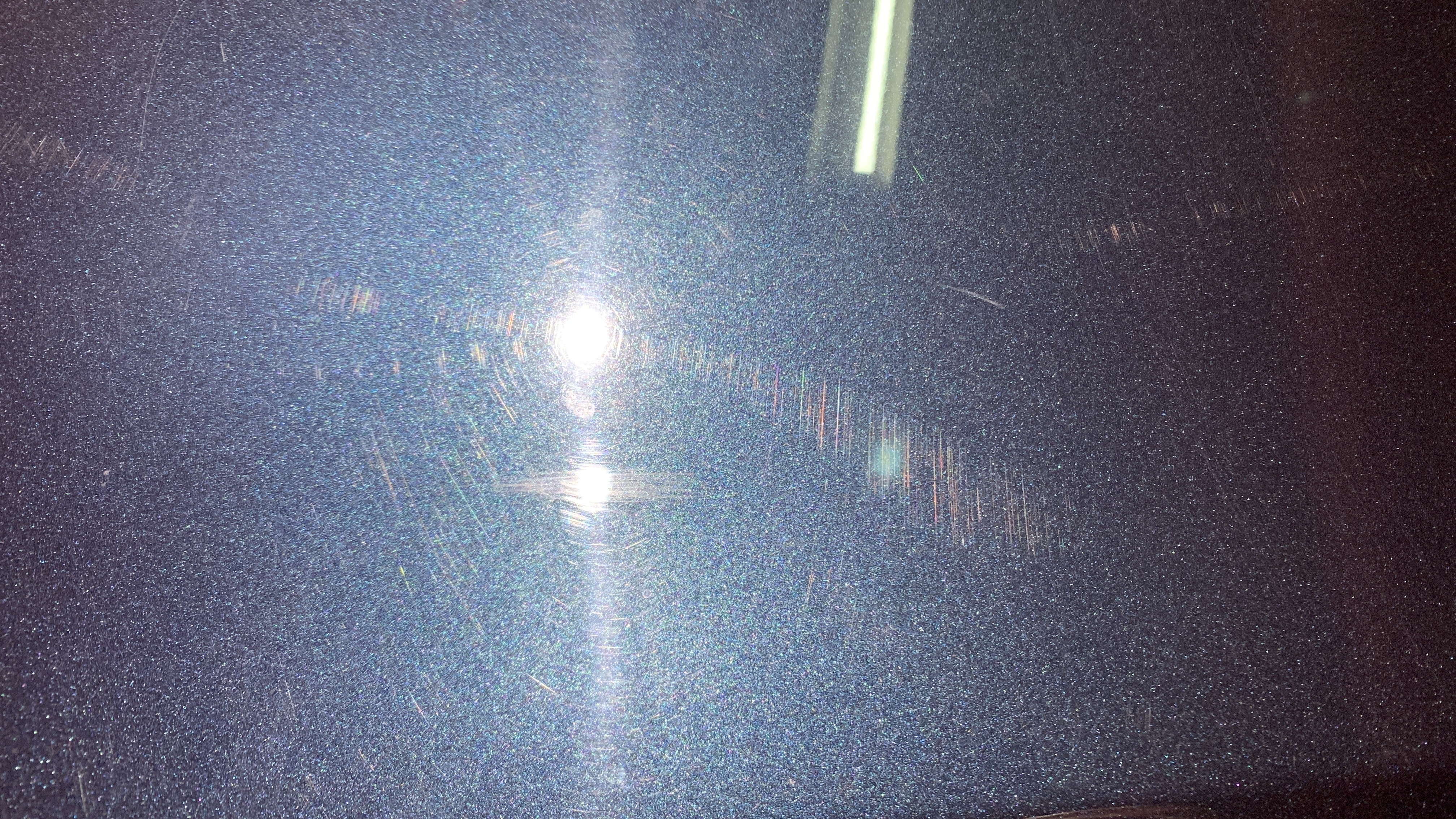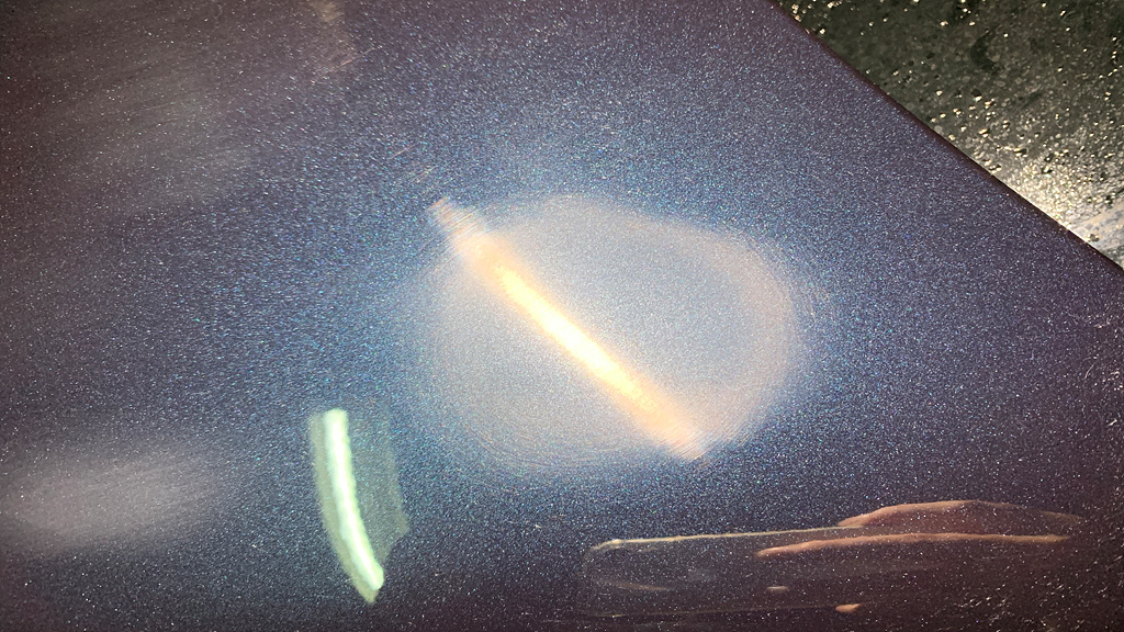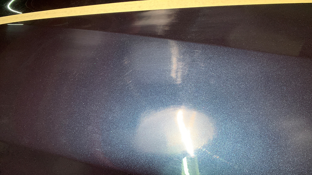 스월마크가 깊어지고 있는 단계로 보입니다. 기본적으로 얕은 스월마크가 도장면 전체에 빼곡히 자리잡고 있고 그 위로 자극이 계속 가해지면서 스월마크의 깊이가 점차 깊어지고 있는 상태로 보여집니다. 몇몇 곳에서 휴지같은 것으로 세게 문지른 흔적들이 보였고, 가늘지만 깊은 스크래치들이 여기저기 관찰되었습니다.