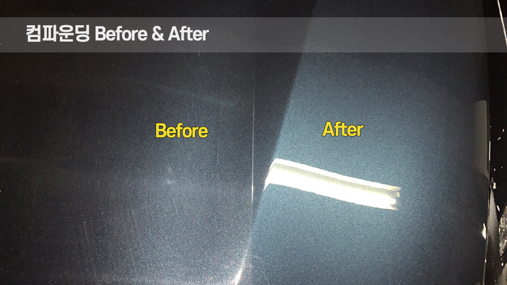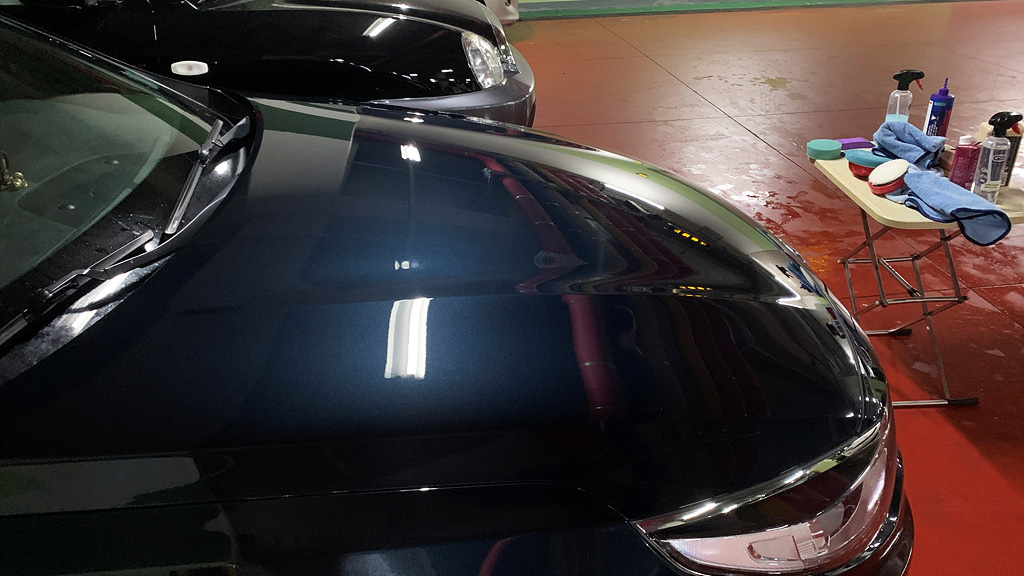 작업 부위 세정, 클레잉, 샌딩을 제외하고 컴파운딩과 마무리 폴리싱에 소요된 총 시간은 약 3시간 30분입니다. 보닛은 작업 부위가 워낙 넓다보니 가장 시간이 많이 걸리는 패널입니다. 보닛 패널의 경우 한 번에 작업을 다 하기 어려울 수도 있습니다. 두 번에 걸쳐 반씩 나눠 컴파운딩, 폴리싱하는 방법, 한 번은 컴파운딩, 또 한 번은 폴리싱하는 방법, 깊은 스크래치는 제외하고 얕은 스월마크만 제거하여 시간을 단축시키는 방법(이런 때에는 나중에 세차 후 틈틈이 깊은 스크래치를 하나씩 잡아가면 됩니다) 등 여러가지 방법을 궁리해 볼 수 있습니다.